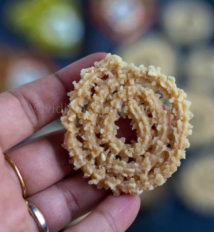 I got introduced to this murukku during my undergrad days. My friends used to bring this murukku from Tirunelveli (a famous city in Tamil Nadu), and I think it’s quite famous. This murukku is white in color, more like thenkuzhal, and of course, it’s crunchy and loaded with coconut milk and coconut oil flavors.