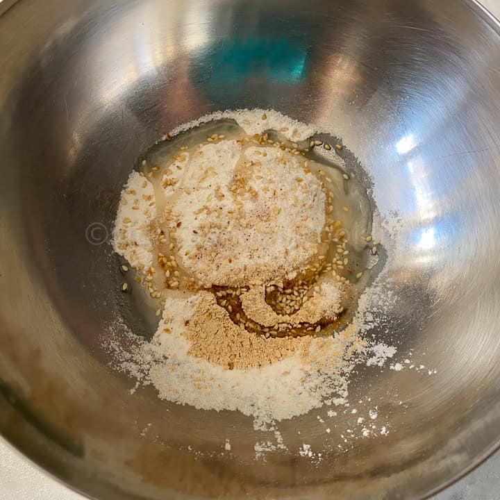 - In a wide bowl, add the rice flour, urad dal flour, 1 tbsp of coconut oil, sesame seeds, salt, and asafoetida. Mix well, and the flour should be more like coarse cornmeal.