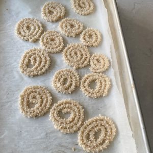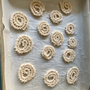 - Brush the other side of the murukku will coconut oil and bake again for 8 minutes.