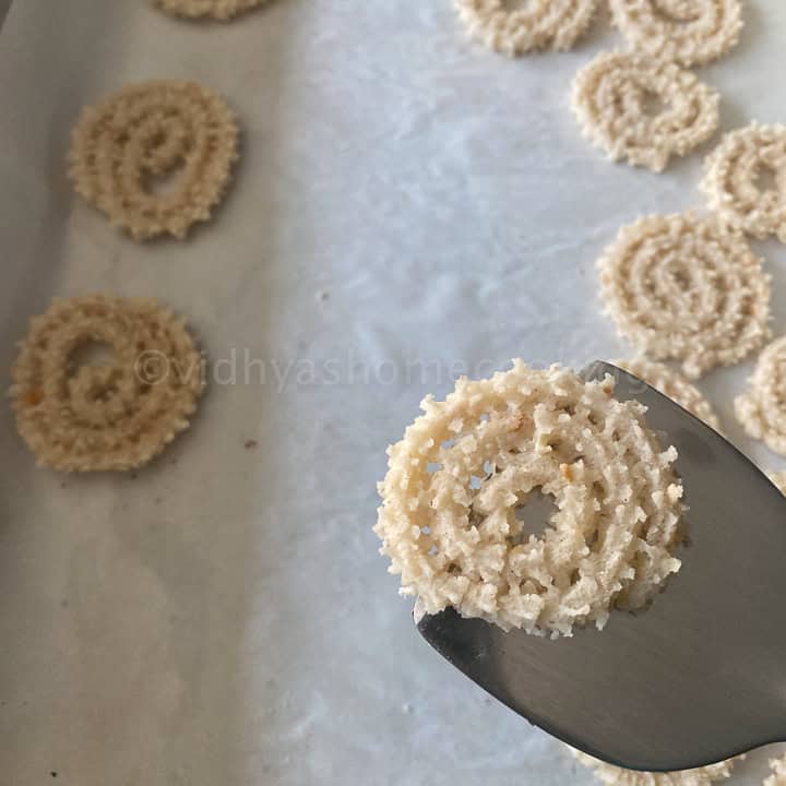 - Brush the murukku with coconut oil and bake the murukku in the preheated oven for 8 minutes. After 8 minutes, the murukku will be all dry, and it is moving freely.