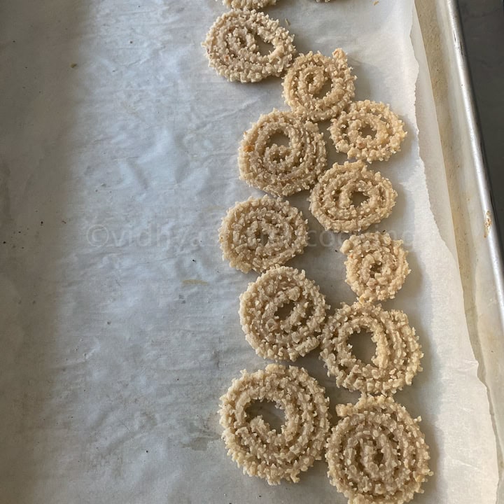 I baked them separately in a small tray lined with parchment paper for 20 minutes at 375 deg. I flipped them once in between. As I wanted to note down the right timing, I did not bake it with the murukku.