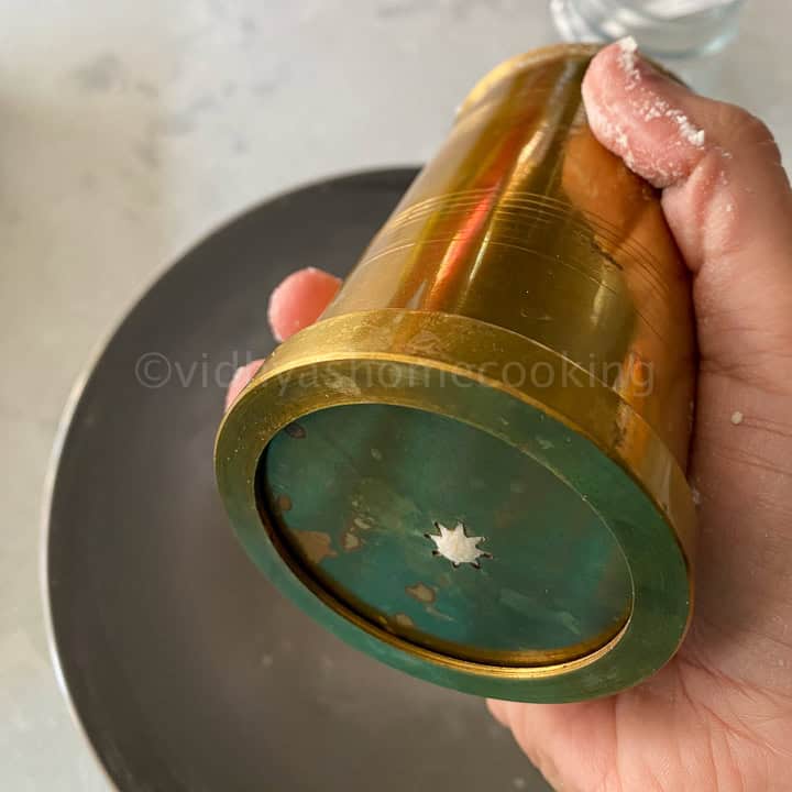 It’s hard to press the murukku when the dough reaches the bottom part of the press. I usually take it out and either press it to thattai or rink murukku like below.