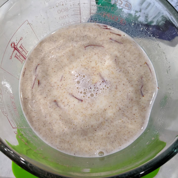 - Add the cardamom powder and saffron to this milk mixture and let it sit for 10 minutes.