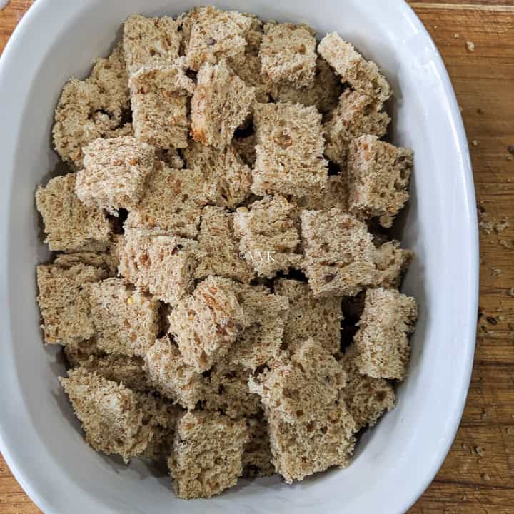 It’s an effortless recipe. You need to cut the bread into small pieces. (PS – I remove the edges and use it for croutons. But you can use the edges as well.) Then prepare a simple milk sauce. I used my microwave to make it, but you can also make it on the stovetop. Pour this milk mixture on top of the milk and bake it. That’s it.