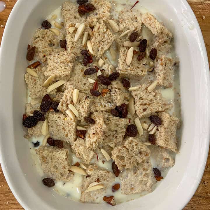 - Add the cardamom powder and saffron to this milk mixture and let it sit for 10 minutes. And pour it slowly on the bread.
