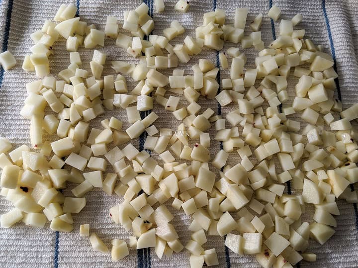 After chopping and washing the potatoes, pat them thoroughly. Spread it on a kitchen towel and gently press with another towel or paper. You can leave it for about 5 minutes but not more than that as the cut potatoes turn brown. That’s why we always keep the cut potatoes well immersed in the water.
