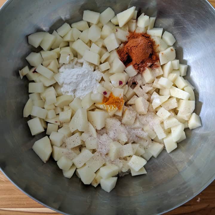 The recipe is straightforward. We first, cut the potatoes and pat them dry. Then add in some essential spices like red chili powder, turmeric powder, and salt. That’s about it. I have tried adding a little of garam masala, fennel powder, chat masala also. But for today’s recipe, I kept it simple just with salt and red chili powder.