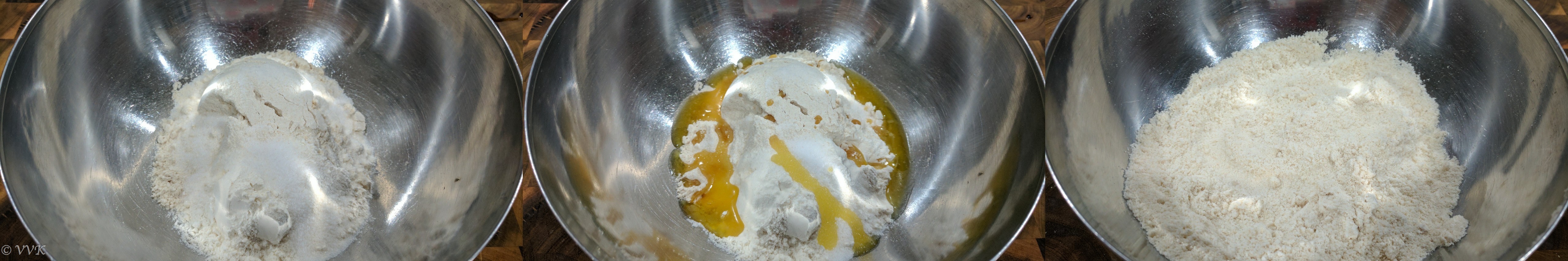 - Add melted ghee and mix thoroughly to coat the flour. Add lukewarm water, little by little, until a stiff, moist dough forms. Do not add all at once.