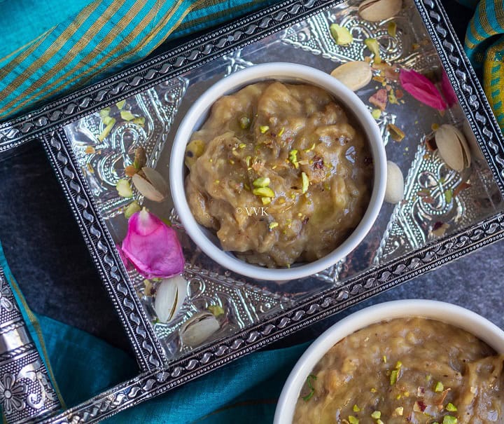 The best part about banana is it freezes well. And you can use the frozen one in smoothies and milkshakes too. This year, I shared vegan banana walnut bread, and now it’s time for a fusion recipe, and it’s the banana biscuit halwa.