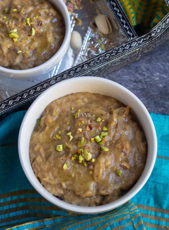 A super-sweet halwa / Indian pudding recipe with bananas and biscuits. A great way to use up all those ripe bananas!