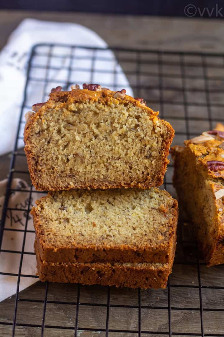 - Allow it to cool for 10 to 15 minutes and run the knife through the edges of the loaf pan and gently remove the cake. Let it cool in the wire rack for 5 more minutes before slicing.