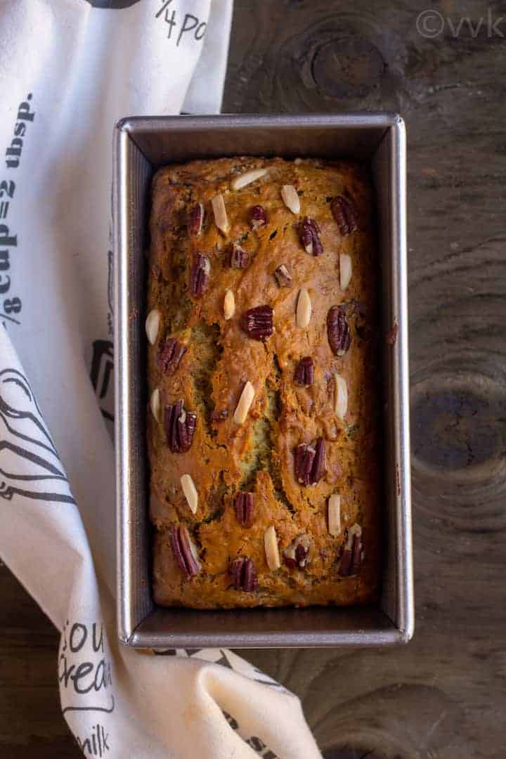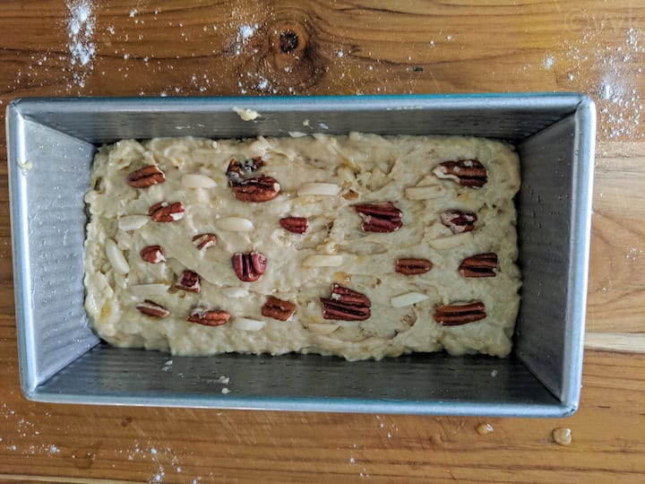 - Transfer this banana bread mix to the greased loaf pan. Spread it evenly and tap it gently. Now place the pecans and slivered almonds on top.