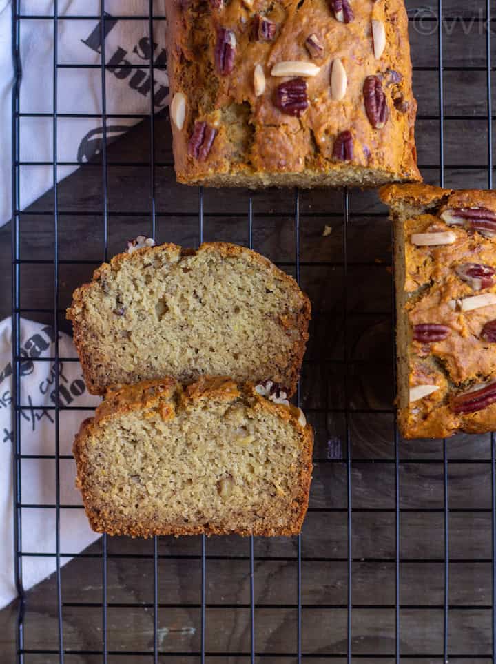 Soft and delicious vegan banana bread recipe! This crowd-pleaser egg-free, dairy-free banana bread is so easy to bake and customize also. Check out my detailed banana bread recipe with step-wise pictures!