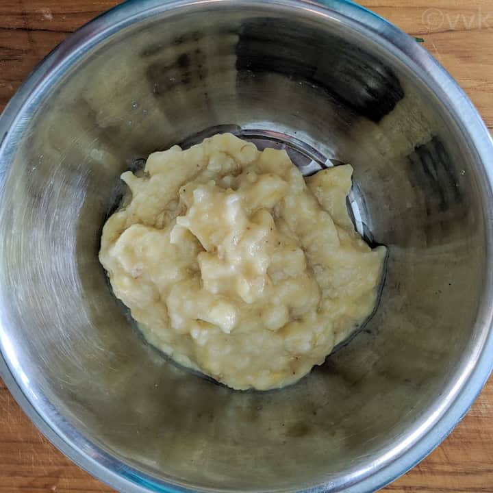 - Mash the bananas using a fork and take 1 cup measure in a bowl.