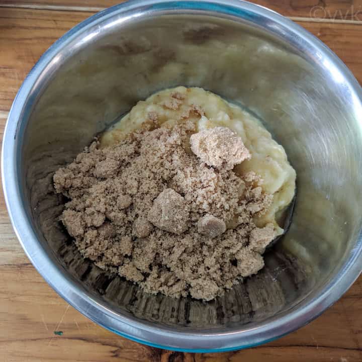 - Mash the bananas using a fork and take 1 cup measure in a bowl. Chunky banana pieces are ok.