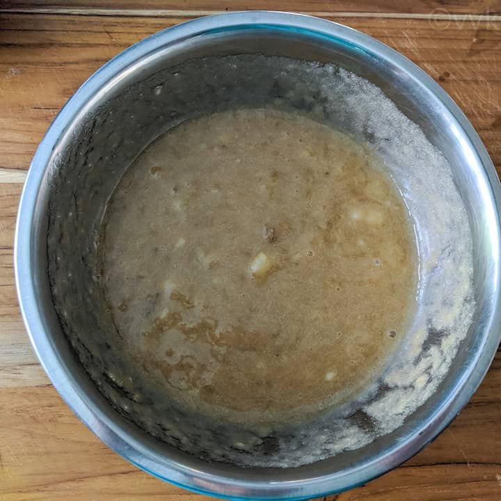 - I tried pureeing the bananas with sugar instead of mashing and blending. When pureed, I felt the bread was slightly dense. So I started mashing them.