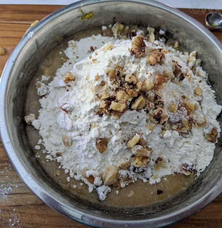 - Now add the sifted APF with salt and the nuts. Gently mix. Just mix until you don't see any dry flour. Do not overmix.