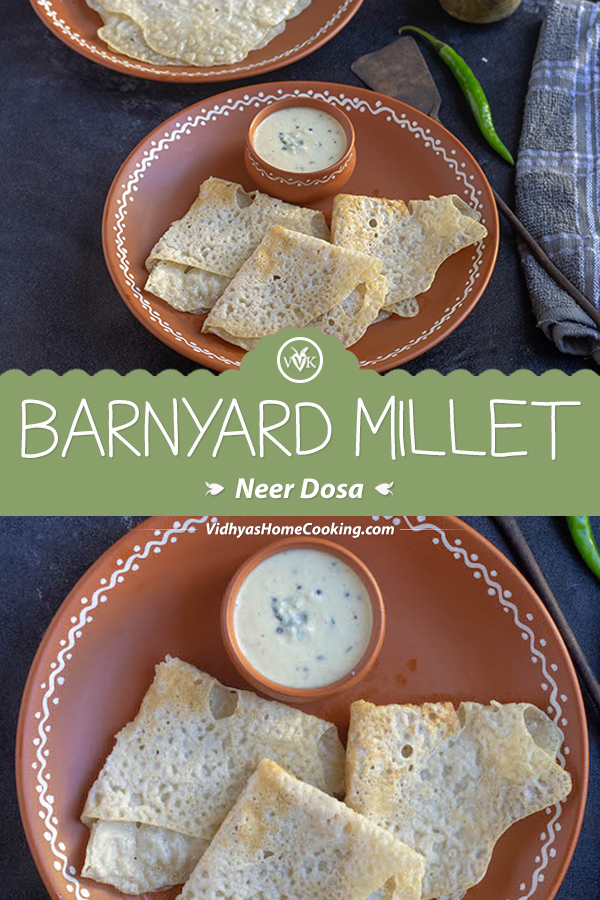 The only thing to keep in mind is millets usually take a long time to cook. When I make this Barnyard Millet Neer Dosa, I typically cover and cook for about a minute and then flip and cook for just 5 to 7 seconds. But this flipping is not required for rice neer dosa. Instead of barnyard millet, you can use any millet variety and make this dosa.