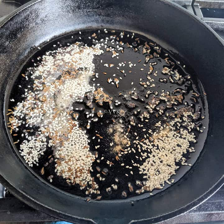 - In a pan or kadai, heat 1 tbsp of oil. When the oil is hot, add the mustard seeds, cumin seeds, sesame seeds, and hing.