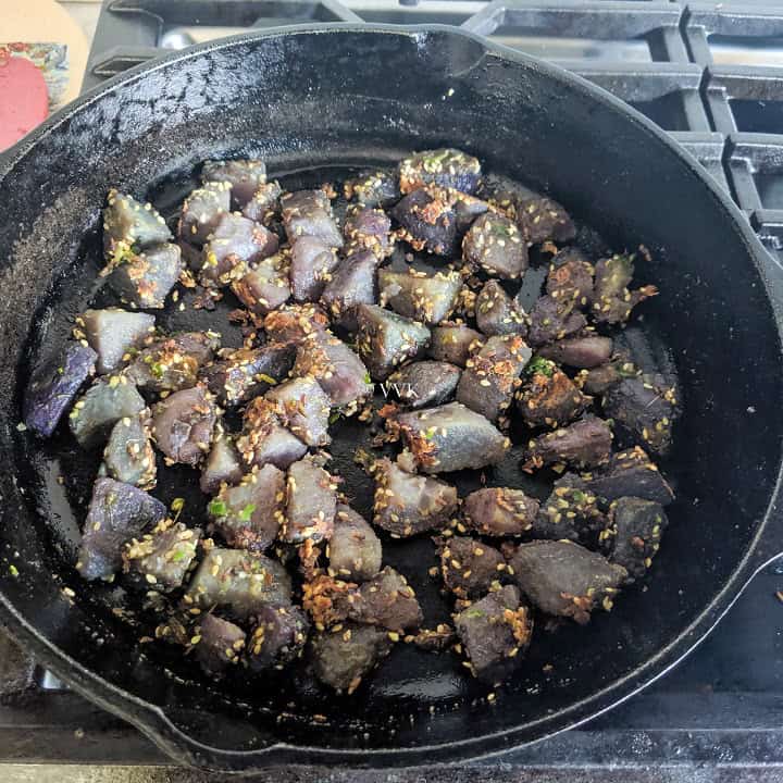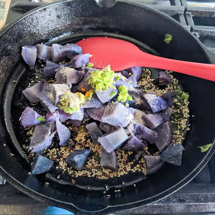 There isn’t any specific reason for using purple potatoes. As I harvested it from our backyard, I went ahead and used it.