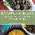 Flavorful Gujarati style potato curry or stirfry with sesame seeds and freshly ground ginger, chili, and cilantro paste, popularly known as batata nu shaak or bateta nu shaak.