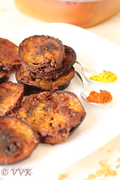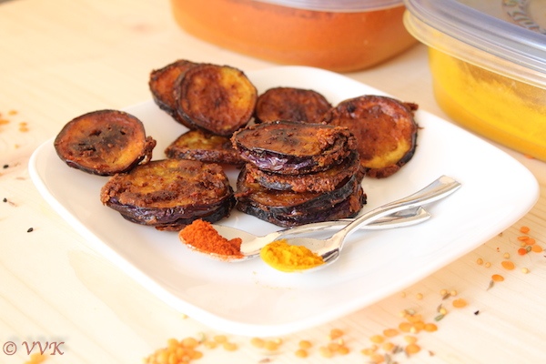 - Once the oil is hot add these marinated eggplant slices and cook until they turn brown and crisp. I cooked on one side for about 3 to 4 minutes and slowly flip them and cooked until they turned brown. If required add more oil.