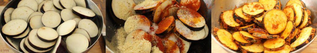 - Add the red chili powder, turmeric powder, salt, chickpea flour and mustard seed powder to the cleaned eggplant slices.