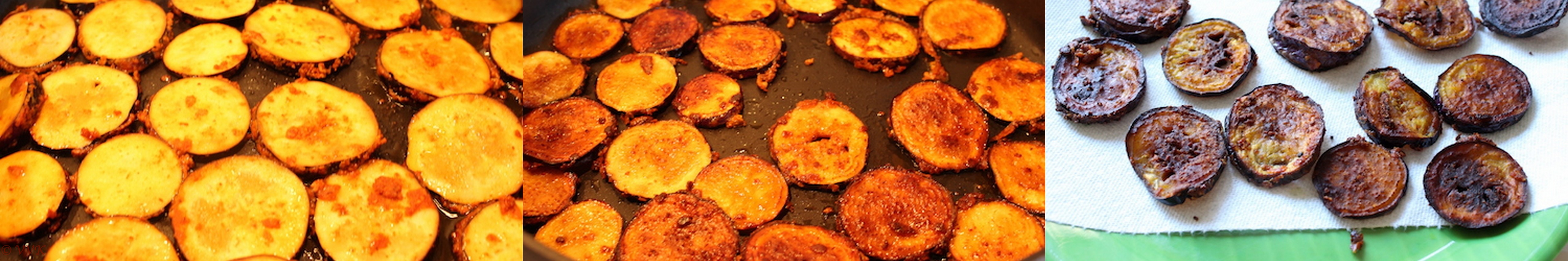 - Once the oil is hot, add these marinated eggplant slices and cook until they turn brown and crisp. I cooked on one side for about 3 to 4 minutes and slowly flipped them and cooked until they turned brown. If required, add more oil.