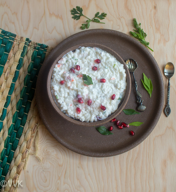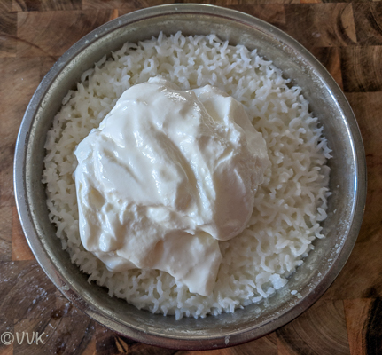 A delicious and creamy South Indian style spiced curd/yogurt rice recipe prepared with yogurt, rice, and milk with detailed instructions and step-wise pictures. It is popularly known as bagalabath or daddojanam or Thayir Sadam.