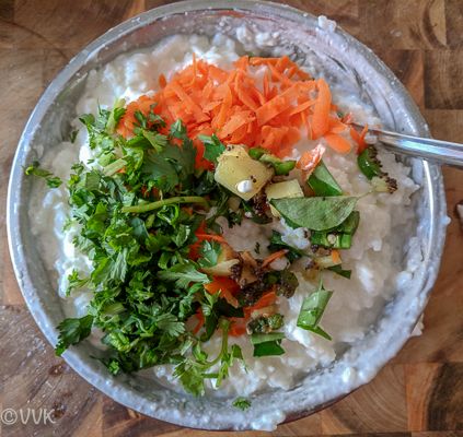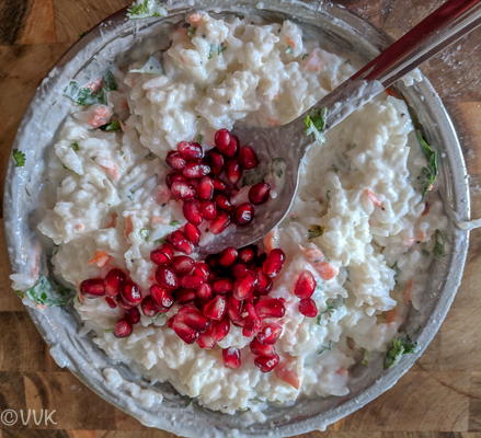Even though creamy yogurt plays a significant role, two main ingredients yield the richness. One is butter, and the other one is the sour cream. I always prefer sour cream for my yogurt rice, especially when packing it for a trip or for potlucks. I know both ingredients might sound odd, but do give it a try. If using butter, then ensure you are using hot rice while making the bagalabath. If you are using sour cream, then you can use leftover rice (as long as you are not making it for prasadam) or cold rice. I went with sour cream for my recipe.