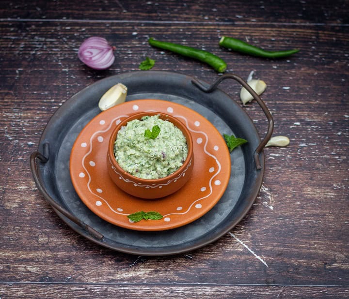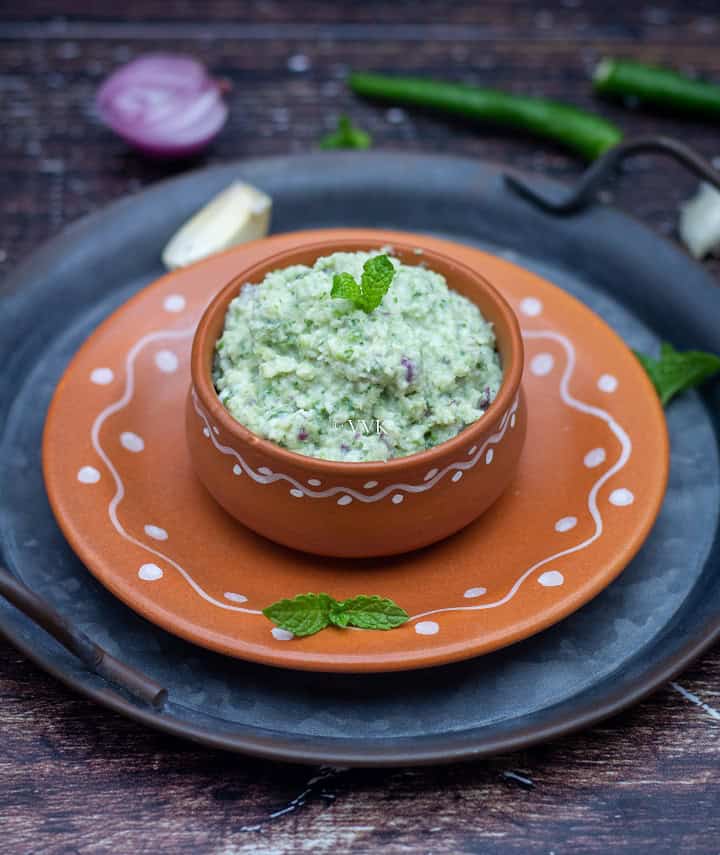 It’s a typical side for biryani, but I liked it with yogurt rice and roti. If you like the raw taste of garlic, shallot, and herbs, you can mix it with plain steamed rice with a dollop of ghee and relish it. Or use it as a sandwich spread.