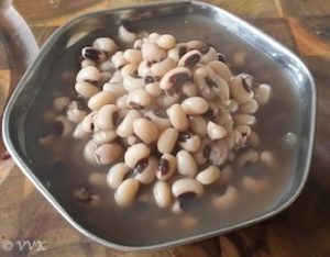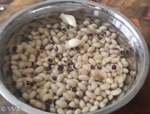 - Soak the black-eyed peas for at least 5 hours and pressure cook the black-eyed peas with two garlic cloves and 2 drops of gingelly oil or castor oil for 3 whistles by adding 2 cups of water.