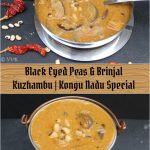A Kongu Nadu special protein-rich, spicy and tangy gravy prepared with black-eyed peas and brinjals and with fresh coconut masala.