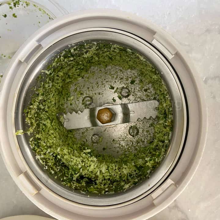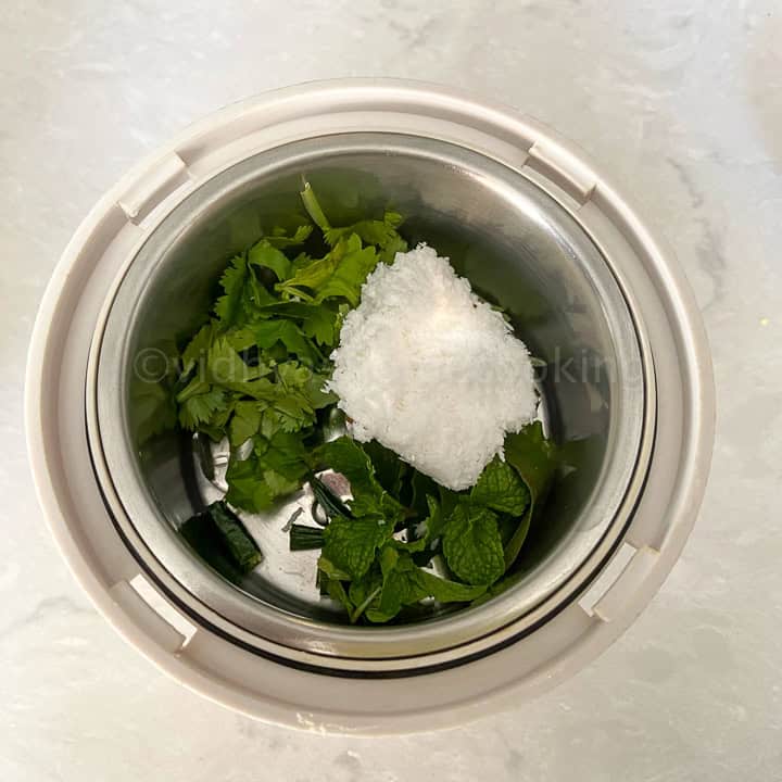 - In a mixer jar or coffee grinder, add the green chilies, cilantro, mint, curry leaves, and coconut. Pulse coarsely without adding any water and set aside.