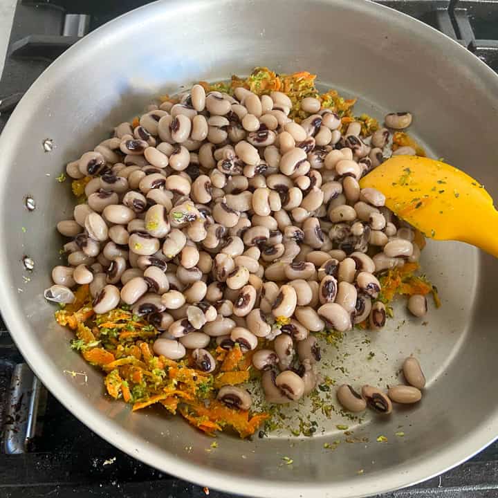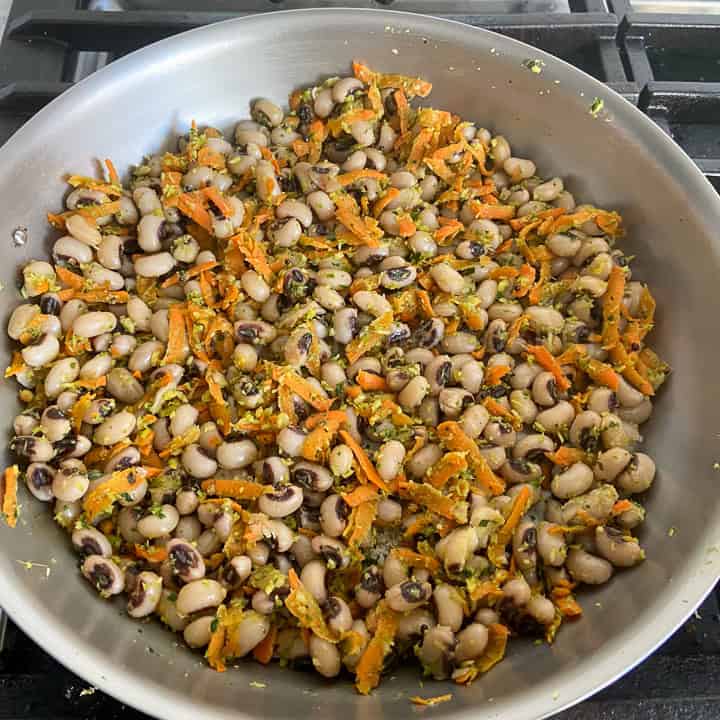 - Add the cooked black-eyed peas at this stage and mix well. Ensure the coconut and ground paste are evenly mixed.