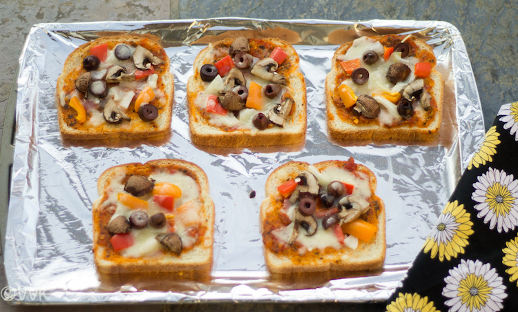 You can use the pesto pizza, shahi paneer pizza, mushroom pizza topping on this bread pizza too. For this recipe, I mix pesto and tomato basil sauce. That’s our favorite combination now, and I use this our pasta as well. :-)