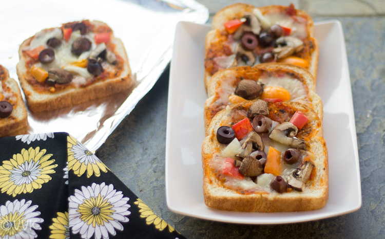 After posting two homemade pizzas from scratch, today I am going to share an easy peasy semi-homemade pizza (errr you can make this from scratch as well) prepared with bread. It’s the bread pizza topped with tomato-pesto sauce, vegetables and of course cheese. This bread pizza is a perfect after-school snack, or if you ask me, I would say its a ideal dinner/lunch too.