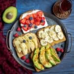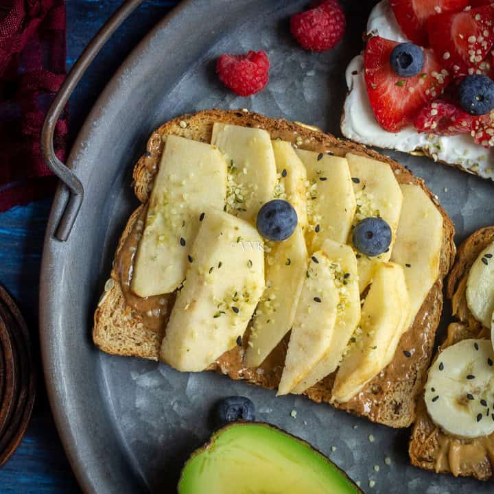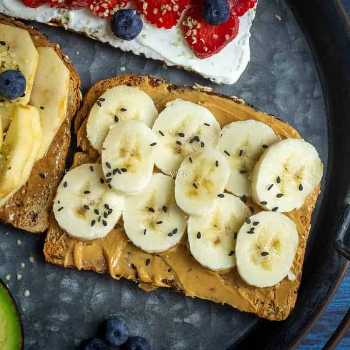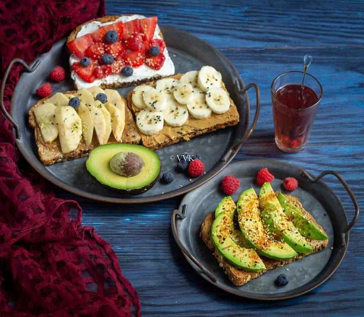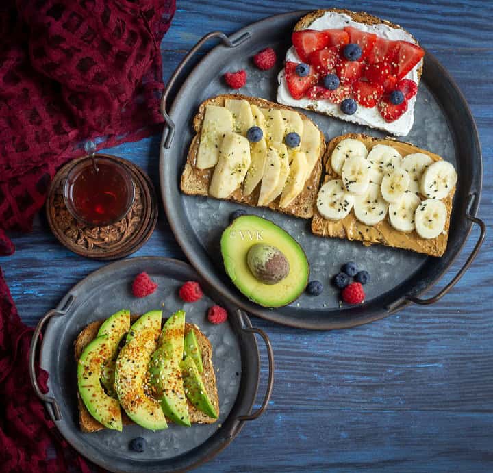 - Fruit Toppings – Fresh seasonal fruits are my go-to option for the breakfast toast. I love apples, bananas, avocados, berries, and peaches on my toast.