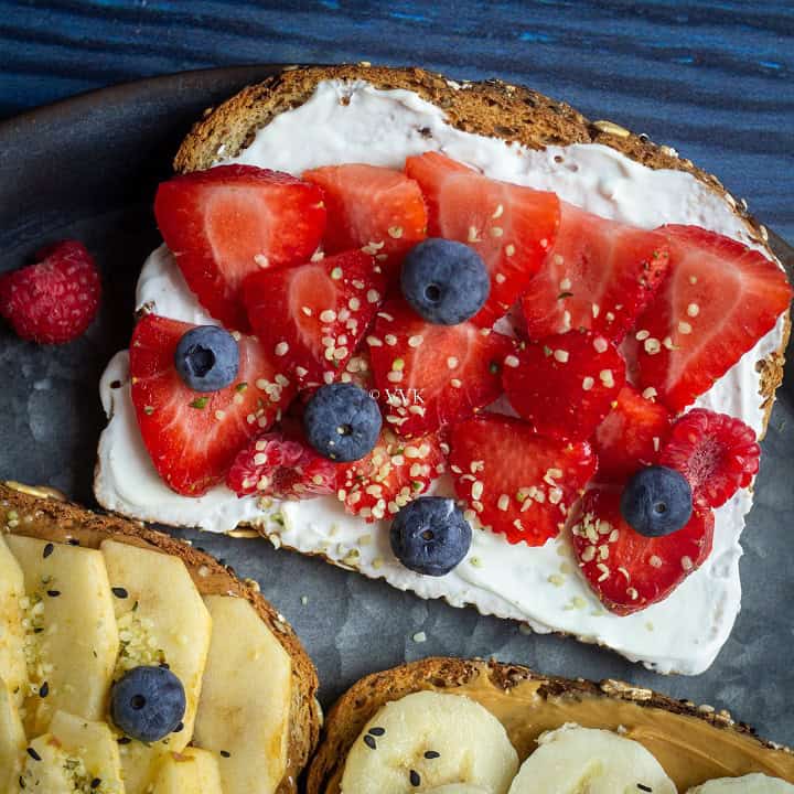 - For this toast, I smear 1 tbsp of cream cheese and then add sliced strawberries and raspberries. Then I sprinkle some hemp seeds. If the berries are not so sweet, I drizzle some honey.