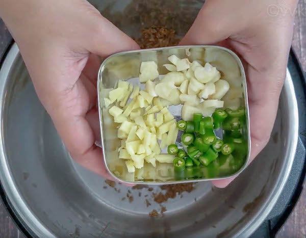 - Then add the chopped green chilies, garlic, and ginger. Saute for 30 to 45 seconds.