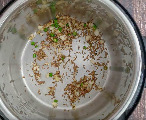 - Set the Instant Pot on saute mode and when the display shows “HOT” add 1 tbsp of coconut oil. When the oil is hot, add the cumin seeds and the asafoetida. Saute for 30 seconds or until the cumin seeds sizzle.