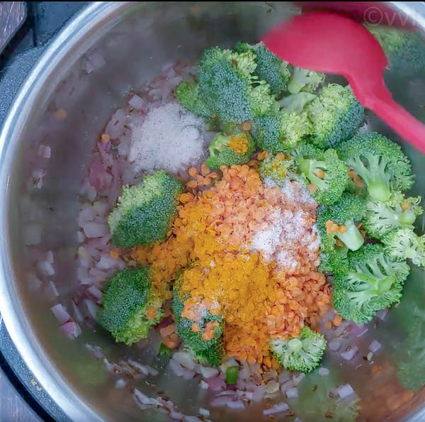 Now, let me share how to make Red lentils with Broccoli in Instant Pot with stepwise pictures and the video. (PS: Check the pressure cooker version below the recipe notes. )