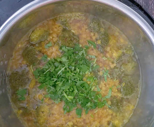 Heat a pressure pan or pressure cooker and add the oil. When the oil is hot, add the cumin seeds and asafoetida and allow it to sizzle. Then add the chopped green chilies, ginger and garlic. Saute for 30 seconds. Next, add the onions and saute until the onion turns soft. Now add the broccoli, lentils, turmeric powder and salt. Mix well and then add the water. Mix again. Close the pressure cooker and cook this for three to four whistles/hisses. Let the pressure release naturally. Open the pressure cooker lid and mash the dal. Add cilantro and allow the dal the simmer over medium heat for 3 to four minutes.