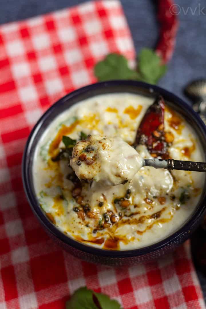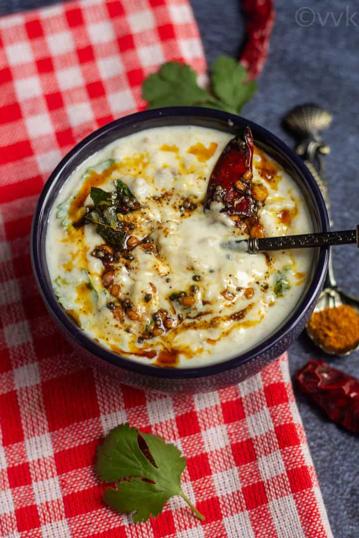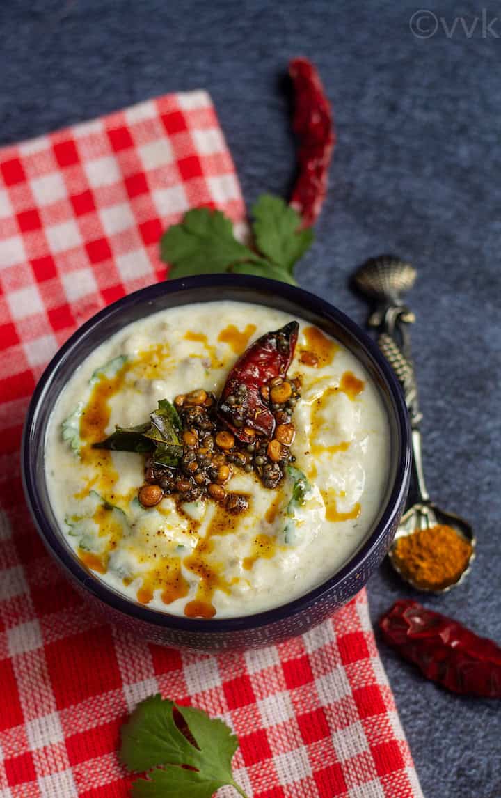 - Heat a pan and add the remaining 2 tsps of oil. Once the oil is hot, reduce the heat to medium-low now. Then, add the mustard seeds, urad dal, chana dal, hing, dried red chili, rasam powder, and curry leaves. Mix and cook it over medium-low heat until the mustard seeds splutter. Turn off the heat and add it to the raita.