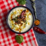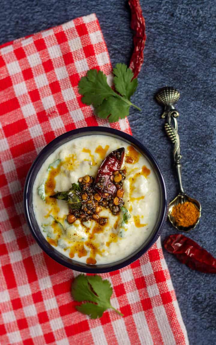 The sky is the limit when it comes to tempering the raita. You can season with mustard seeds and cumin seeds or do like how I did. I went with mustard seeds, urad dal, and chana dal. Hing or asafoetida enhances the flavor, so don’t skip it. If you have gluten issues, opt for gluten-free hing.