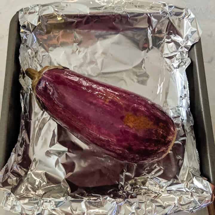 - Line a cookie tray or cake pan with aluminum foil. Apply the 2 tsps of oil over the eggplant and place it in the tray.