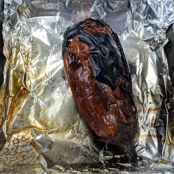 Most of the ovens here in the US should have broil mode. But if your oven doesn’t have that mode, bake the eggplant at the highest possible temperature for a longer time. I am broiling here for 40 minutes. You might have to bake for one hour. I always keep my food in the middle rack for both baking and broiling.
