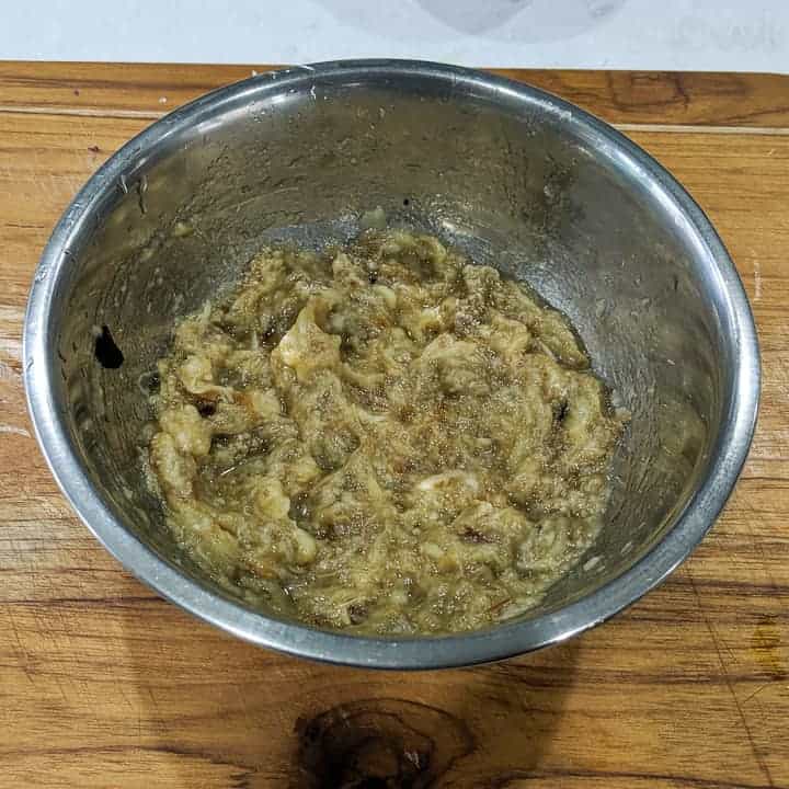 - When the eggplant is easy to handle, remove the skin. It easily comes off. Remove the flesh and mash it thoroughly.