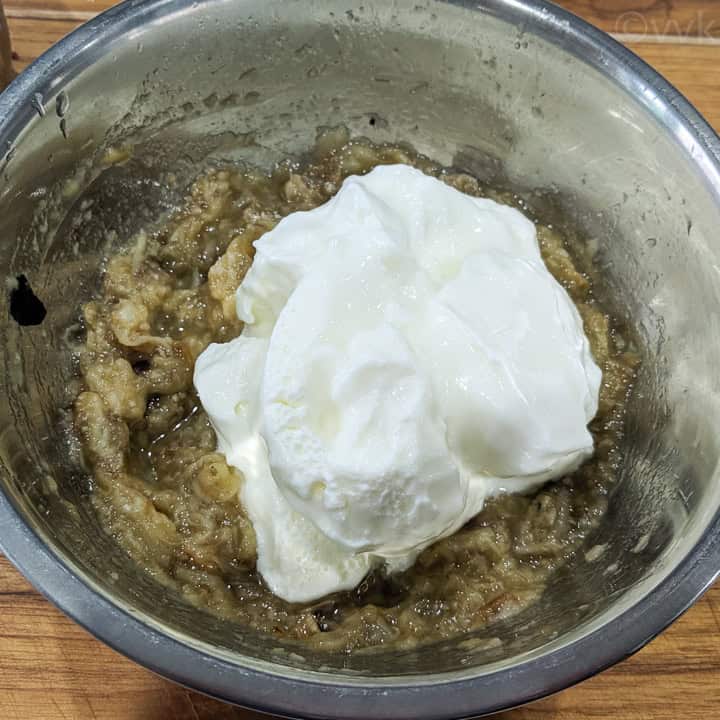 - I prefer one cup of yogurt for this measure. You can adjust depending upon the amount of the mashed eggplant.
