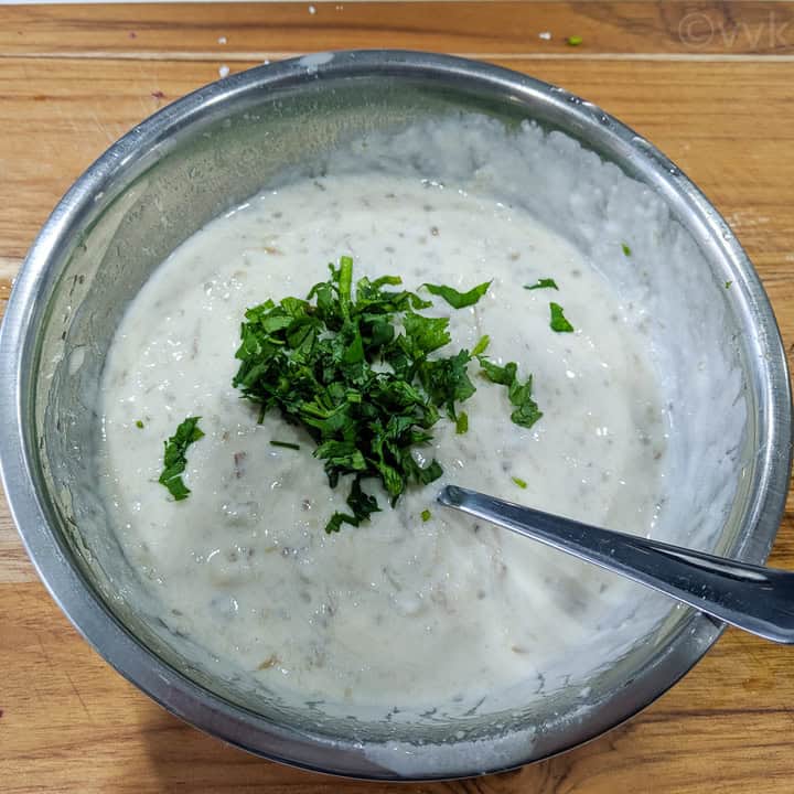 Oven baking time may vary depending on the model. So always keep an eye on the food. For this raita, keep an eye after 35 minutes, and if it’s well cooked and nicely charred, remove it from the oven.